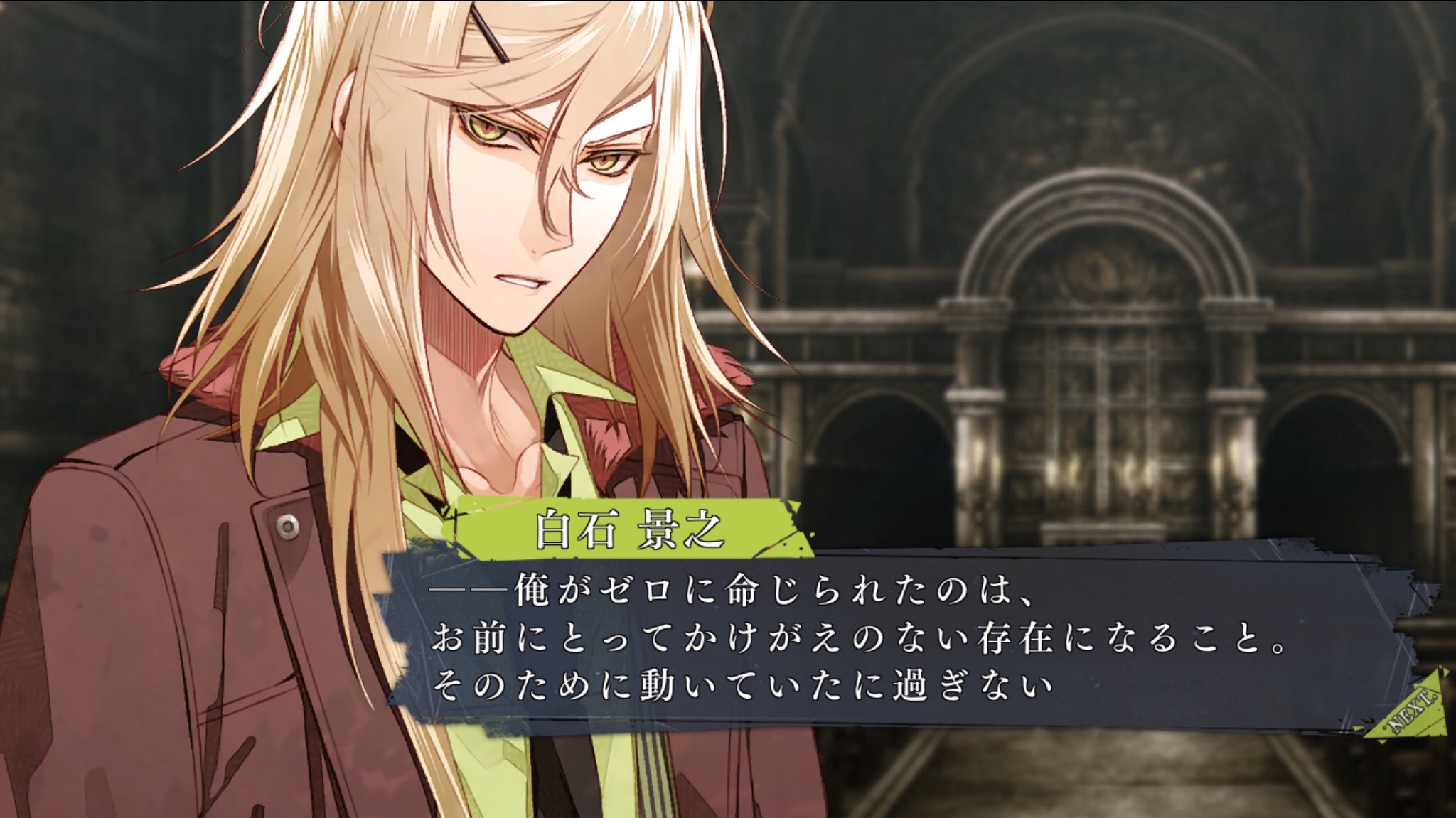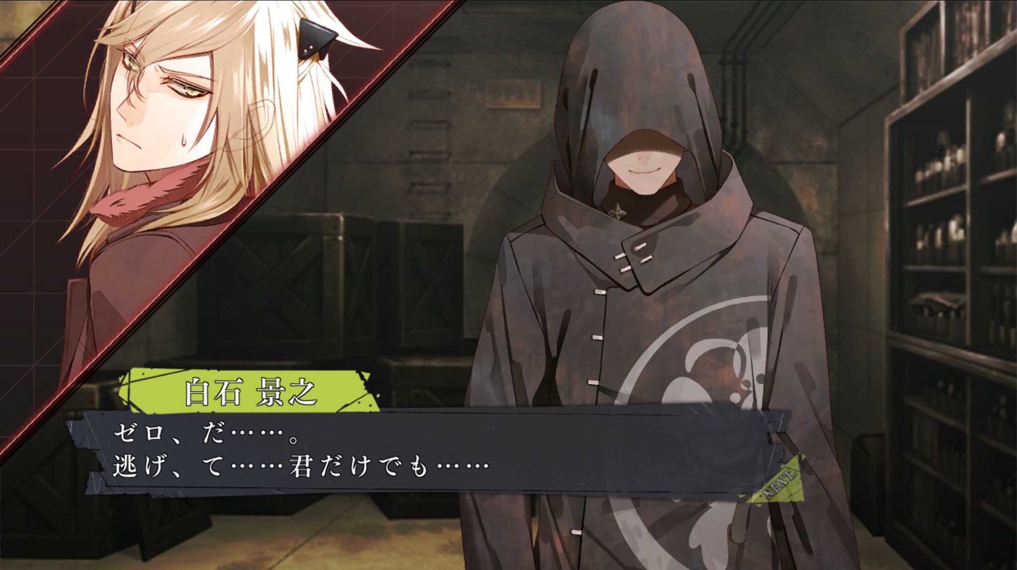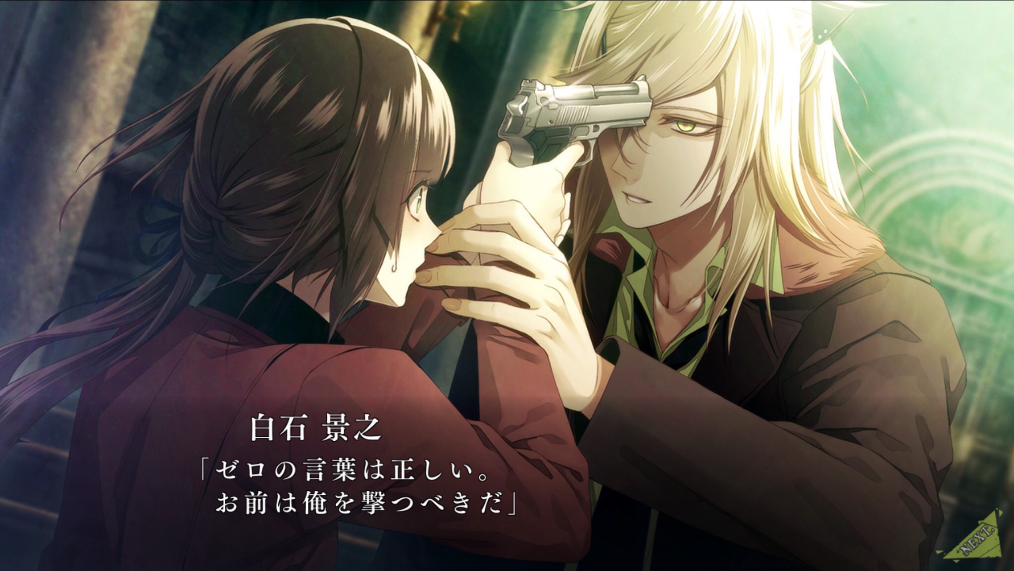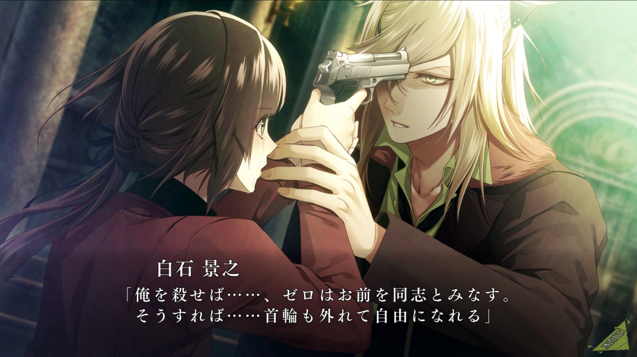 주인공의 필사적인 설득으로 카게유키는 처음으로 제로의 명을 거역하고 둘은 그 자리에서 도망침. 하지만 쫓아온 제로가 내는 특수한 주파수(?) 때문에 카게유키는 매우 고통스러워함ㅠㅠㅠ 주인공이 총으로 제로의 심장을 맞춰서 죽이지만 그것과 동시에 제로가 목걸이를 발동시키고 주인공은 독 때문에 의식을 잃음ㅜㅜㅜㅜ