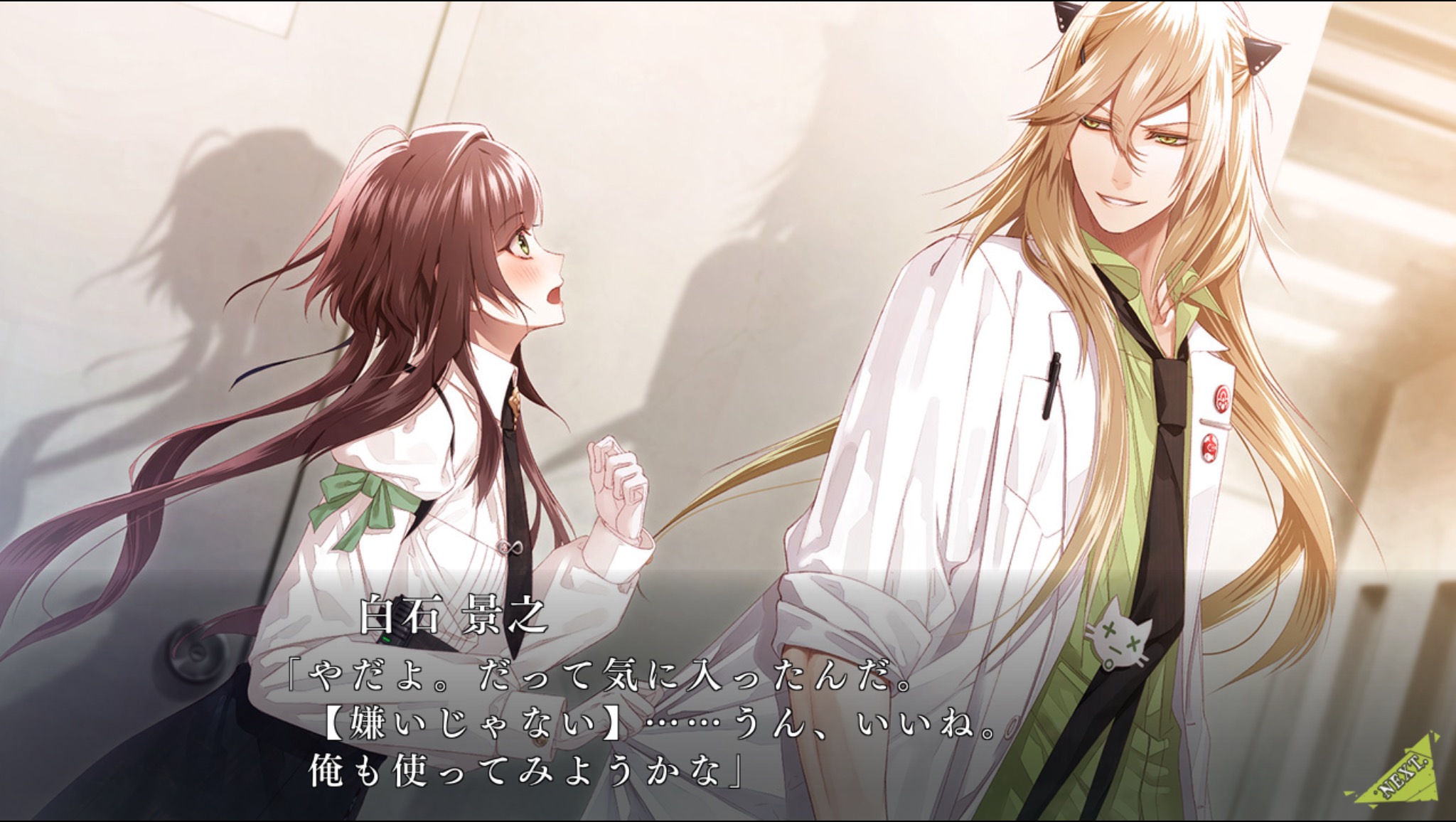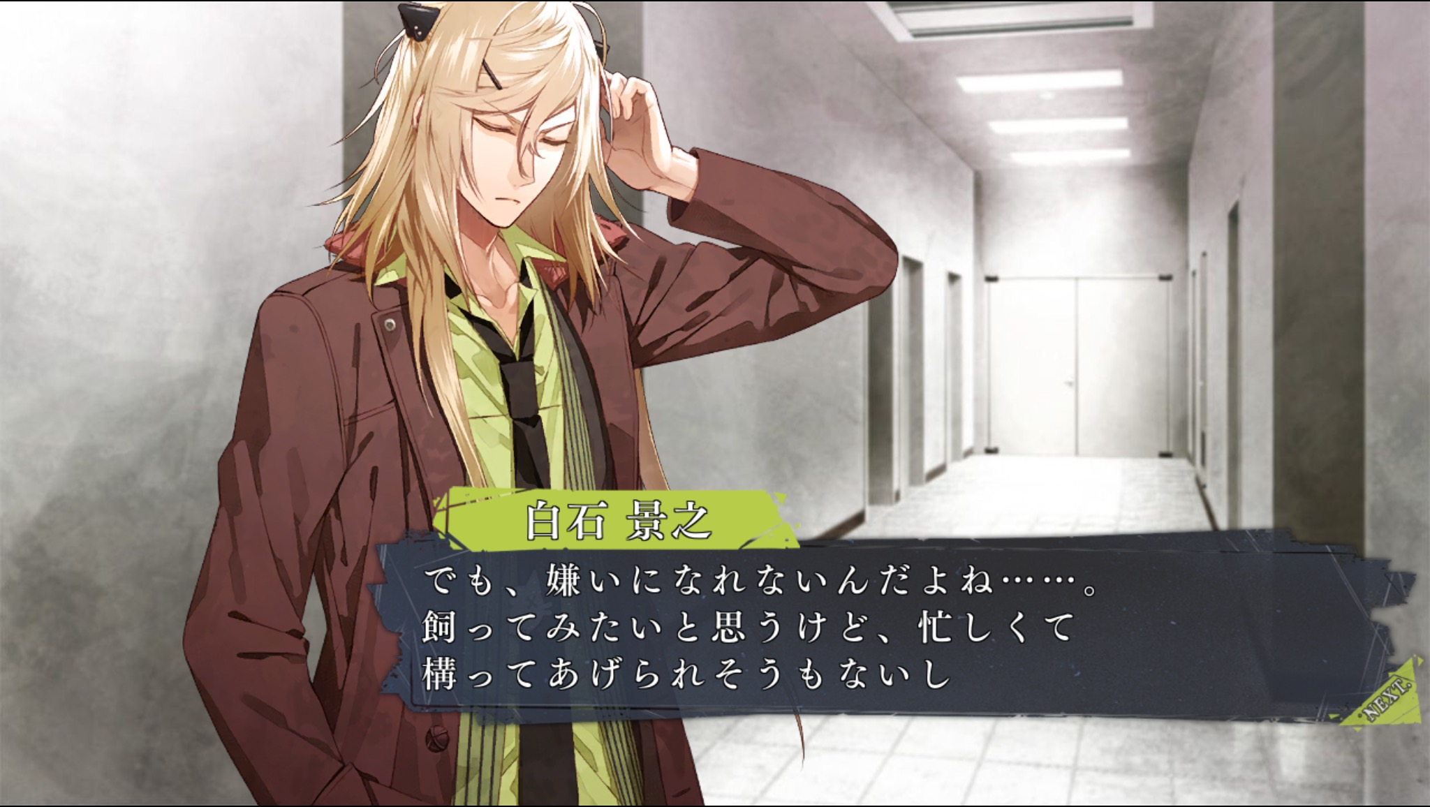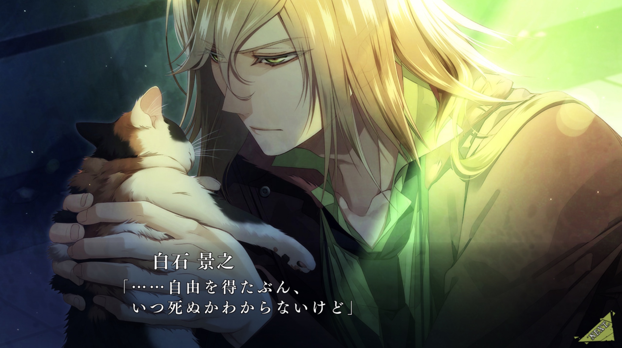 여기서 카게유키가 고양이를 좋아하는 건 '자유롭게 살아가는 모습에 대한 동경' 이라는 걸 어렴풋이 알 수 있는데 이건 루트 중간중간에도 언급이 된다.