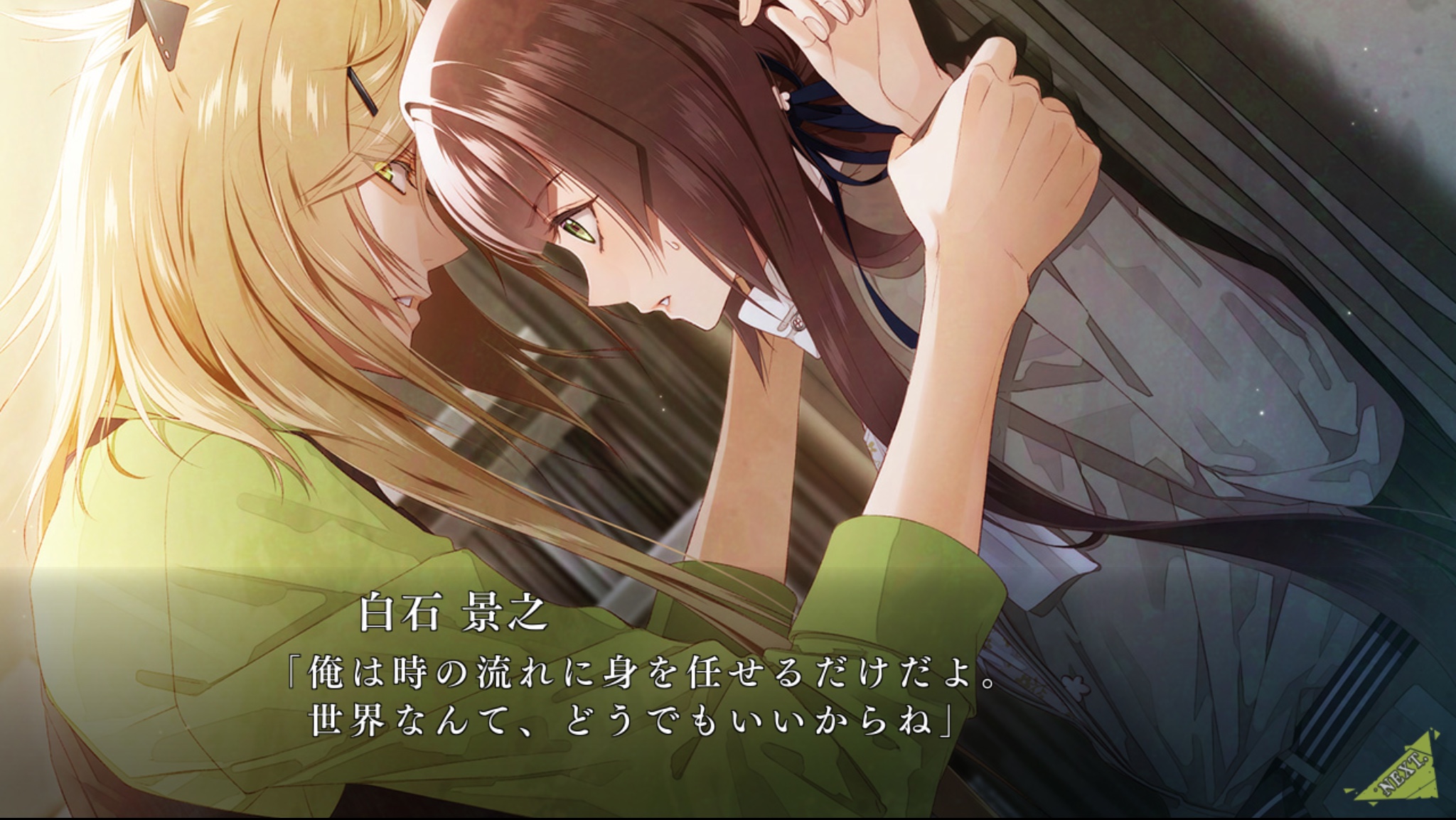 비련엔딩에서는 주인공이 제로를 죽이지 못하고, 제로가 목걸이를 발동시켜서 주인공은 그대로 잡혀버림. 그 후로 제로에 의해 세뇌교육을 당한 주인공은 정신이 망가지고 아도니스의 일원으로서 살인을 반복함. 심지어 탐정사무소의 멤버들도 다 죽인다ㅠㅠㅠ 카게유키는 제로가 뭘 했는지 목소리를 잃고 주인공의 곁을 지킴ㅠㅠㅠㅠㅠㅠㅠ